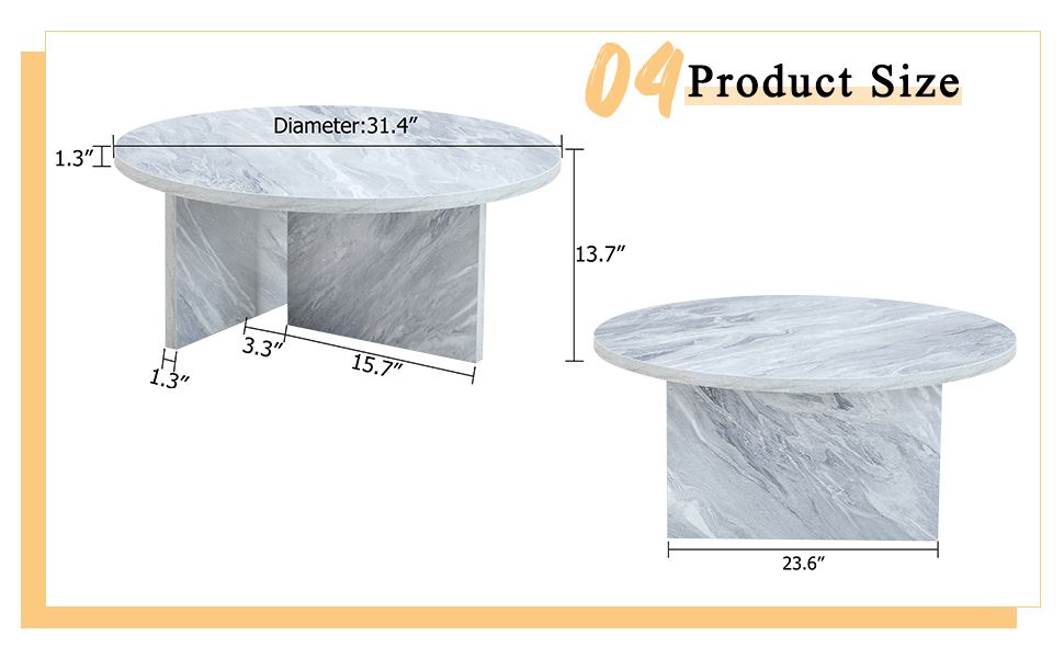 [Perfect Size for Multiple Uses]: This living room round marble coffee table has a diameter of 31.50 inches and a height of 13.98 inches, meticulously designed to seamlessly integrate into various living room settings. Its compact yet spacious surface makes it an ideal choice for serving snacks, displaying decorations, or simply enjoying leisurely gatherings.