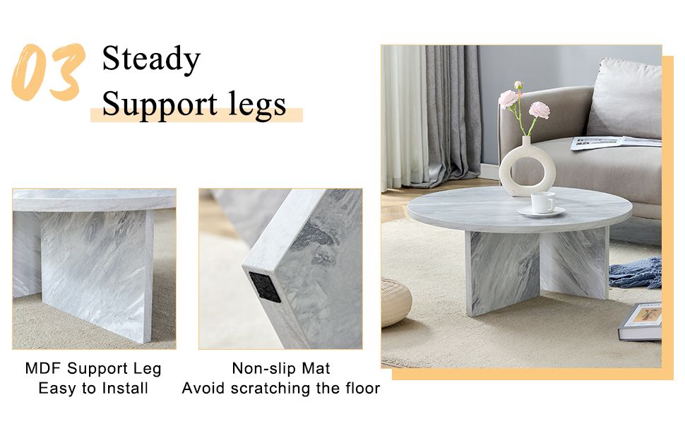 [High-Quality Materials]: This round coffee table is made from high-density and uniform MDF material, providing excellent stability and durability. It also has good impact resistance, able to withstand bumps and impacts in daily life. Maintenance is relatively simple, just wipe with a mild cleaner and a soft cloth.