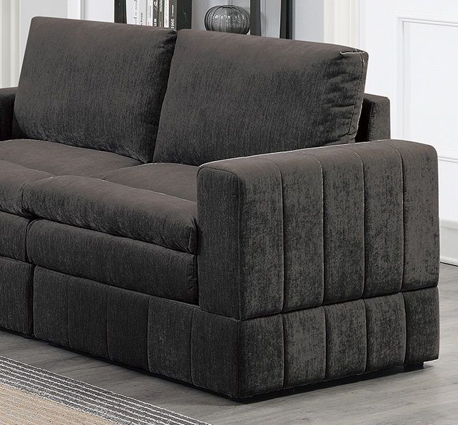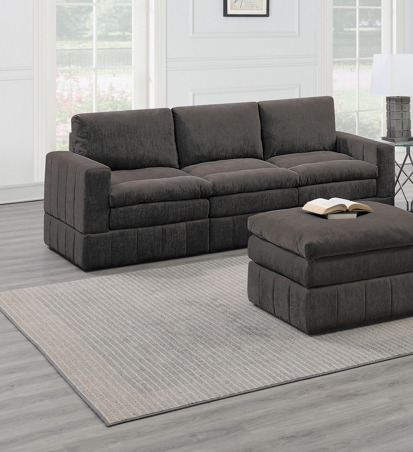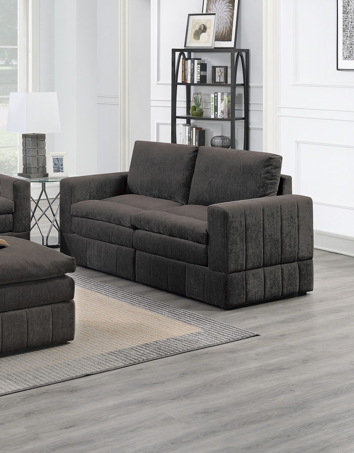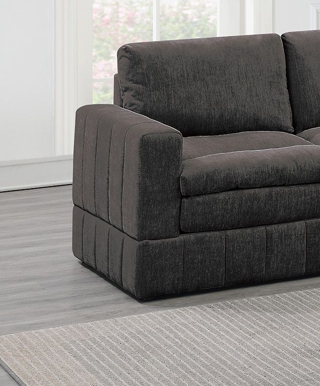 A triple layer cake comes to mind with this extraordinary designed modular sectional set. Each piece is crafted with three tiers topped with plush pillow-top seating and back support to match. Go straight to the moon with this 6-piece set that provide comfort and style that is out of this world. Explore your options with a traditional sectional or try a loveseat, sofa and ottoman combo to suit your style and comfort. This set includes two of each of the following: Right/Left one-arm chair, armless chair, and ottoman. Available in a smooth suede-like fabric in granite and mink.