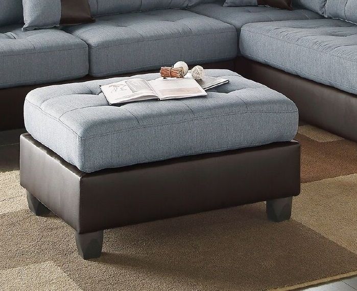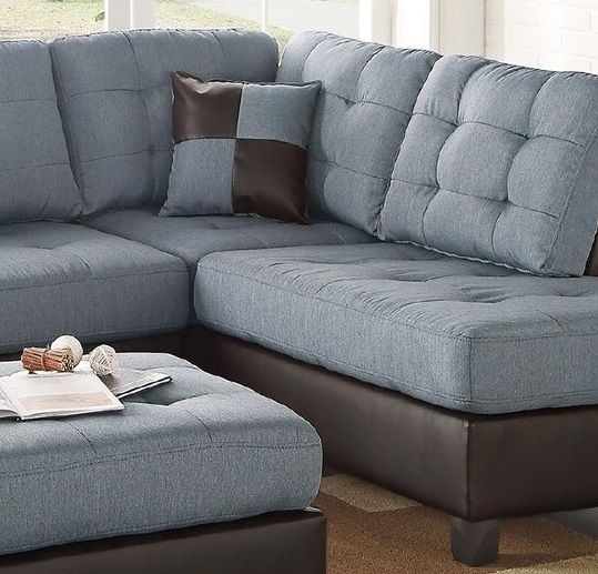 Both multi-dimensional in color and texture, this 3-piece sectional features linen-like seating framed in dark brown faux leather. Both accent tufting and light stitching add to the contemporary style. This sectional also includes a matching cocktail ottoman. Available in chocolate, grey, or teal.
