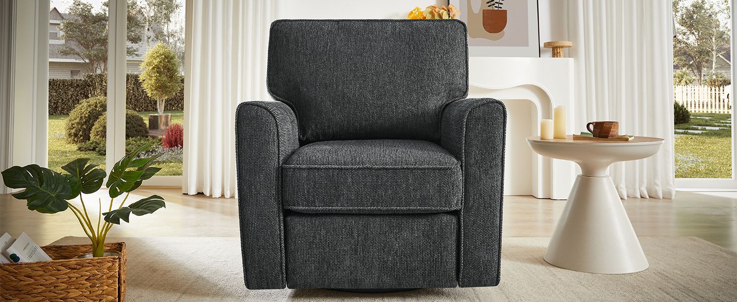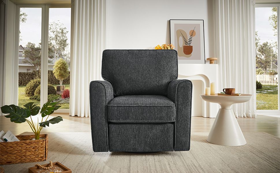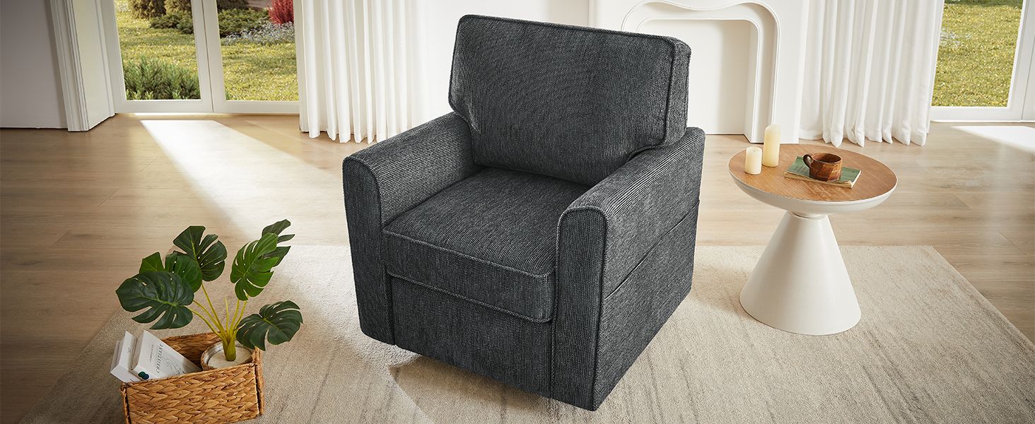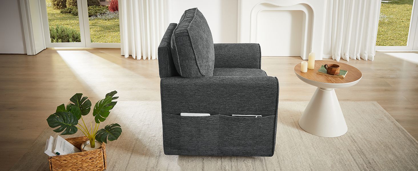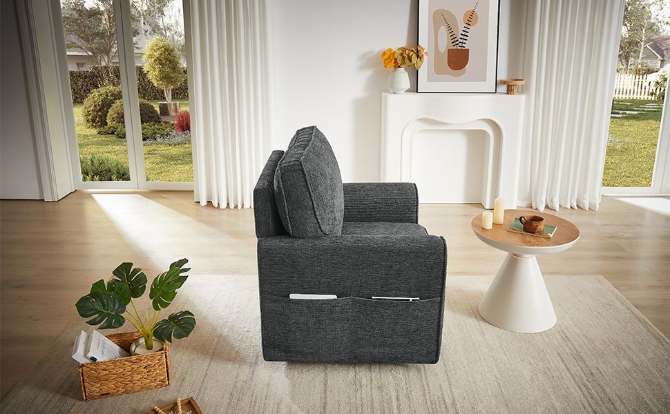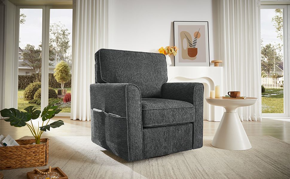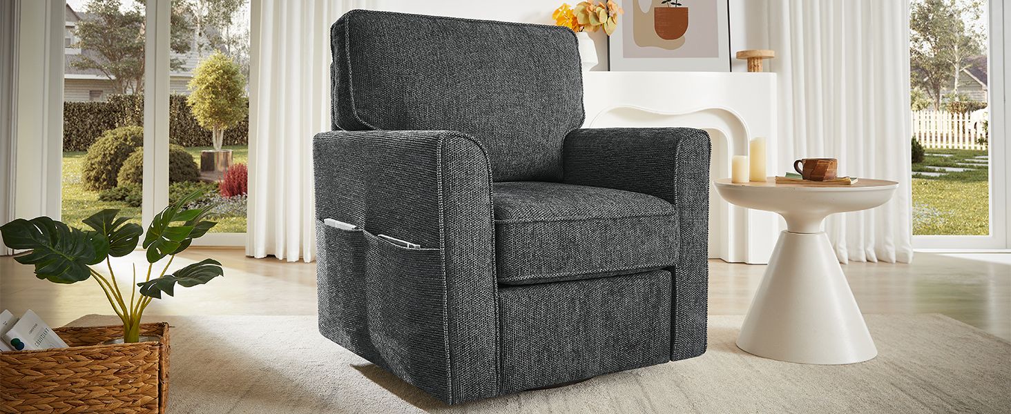 This 360-degree swivel armchair combines style, comfort, and functionality in one sleek design. Upholstered in soft and durable chenille fabric, it offers a luxurious feel while being easy to maintain. The chair's ergonomic structure ensures maximum support for the back and arms, providing comfort during extended use. Its convenient side storage pockets offer a practical solution for organizing small items like magazines or remotes, keeping your space tidy. With its modern, rounded armrests and compact size, this chair fits perfectly into smaller spaces without compromising on comfort. Ideal for any room, it brings both elegance and functionality to your home or office.