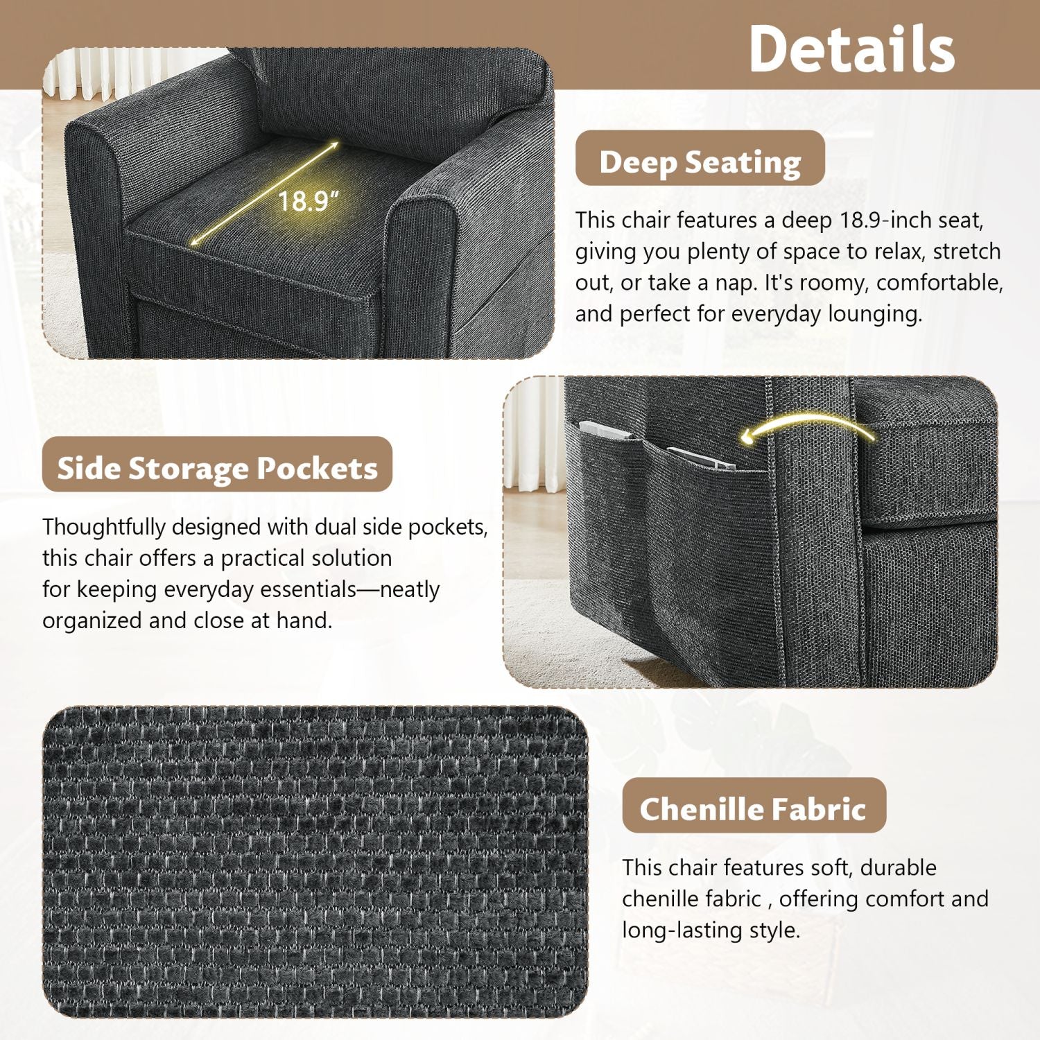 Sink into the generously deep 18.9-inch seat, designed to cradle you in comfort whether you're lounging, stretching out, or enjoying a peaceful nap. With its expansive and inviting form, this chair redefines relaxation—perfect for those who savor space and style in equal measure.
