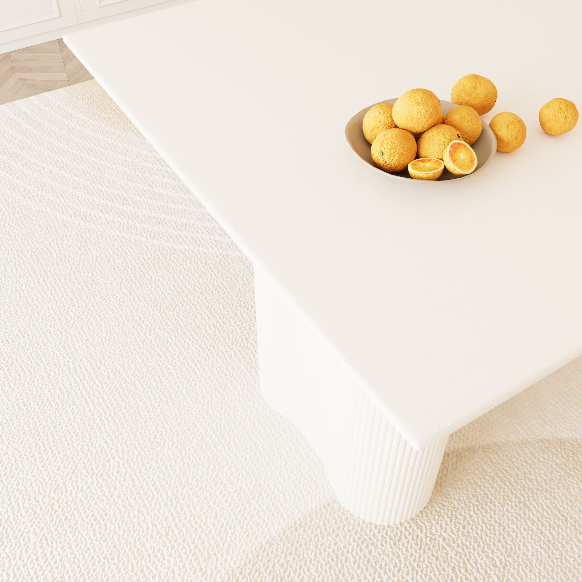 2.Cream finish coffee table: This table features a fashionable milky white finish, with a luxurious cream tabletop and thick, round legs carved with delicate patterns like waves, adding a touch of delicacy to any dining space.