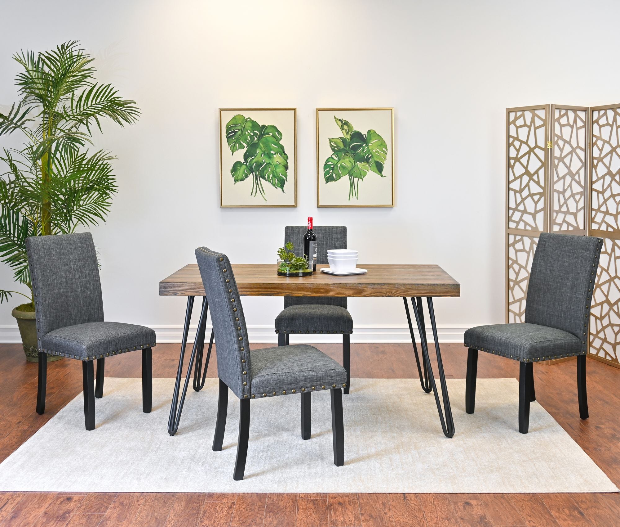 HIGHLIGHTS: The dining table features a metallic hairpin design, which adds both stability and style. It has a rustic dark pine finish and showcases a natural wood grain texture, offering an elegant look. The chairs feature fabric upholstery with brass nailheads, adding texture and visual appeal.