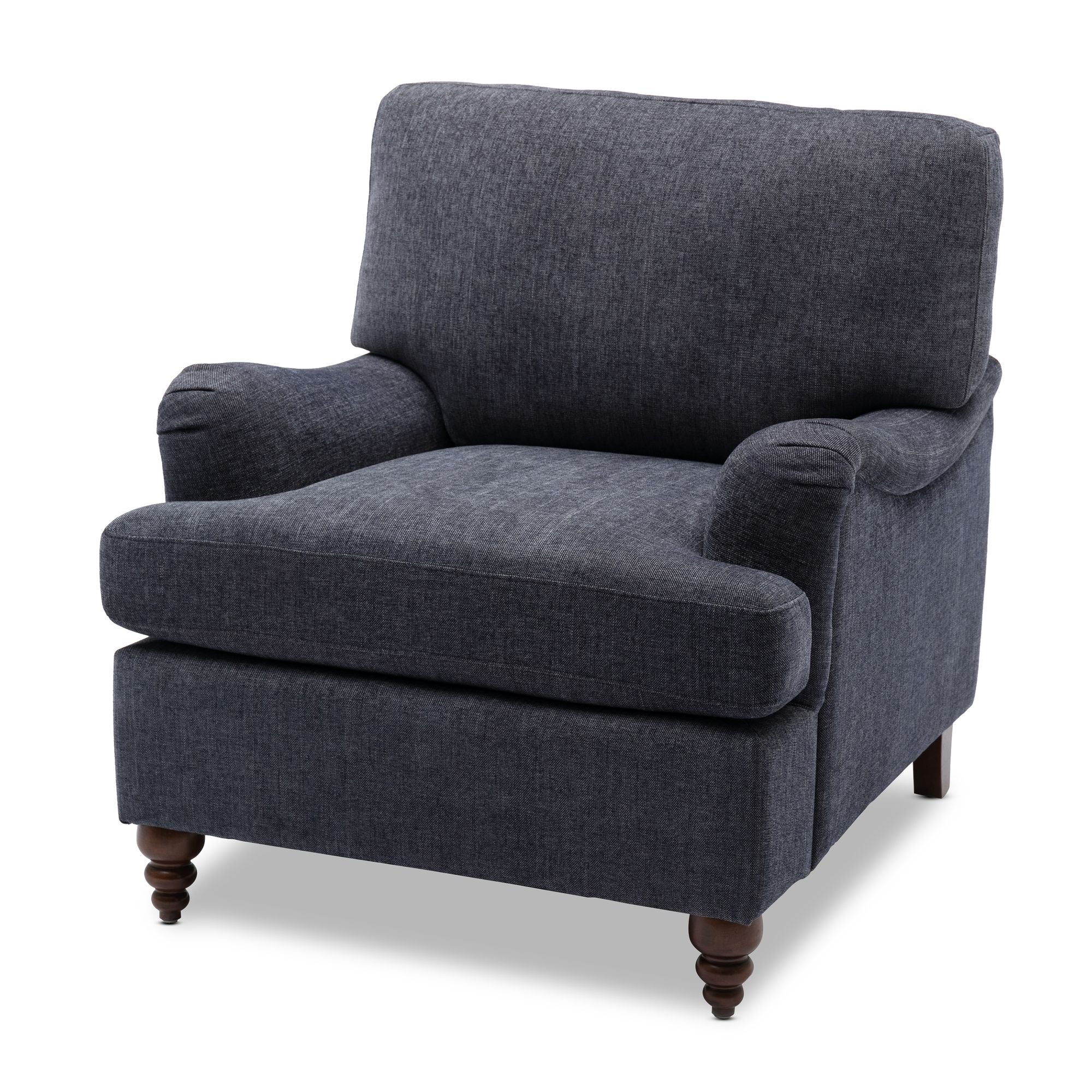 The Candor Arm Chair welcomes you home with classic styling and well appointed details. The tailored English Roll arms offer a graceful shape while the overstuffed seat and back cushion allow you to nestle into comfort. Solid wood turned front legs are finished in a deep walnut stain adding to this chairs timeless appeal. Just right to complete a seating area or for use in the office or bedroom. Available in your choice of Sea Oat, Oatmeal or Navy. Your purchase includes one arm chair.