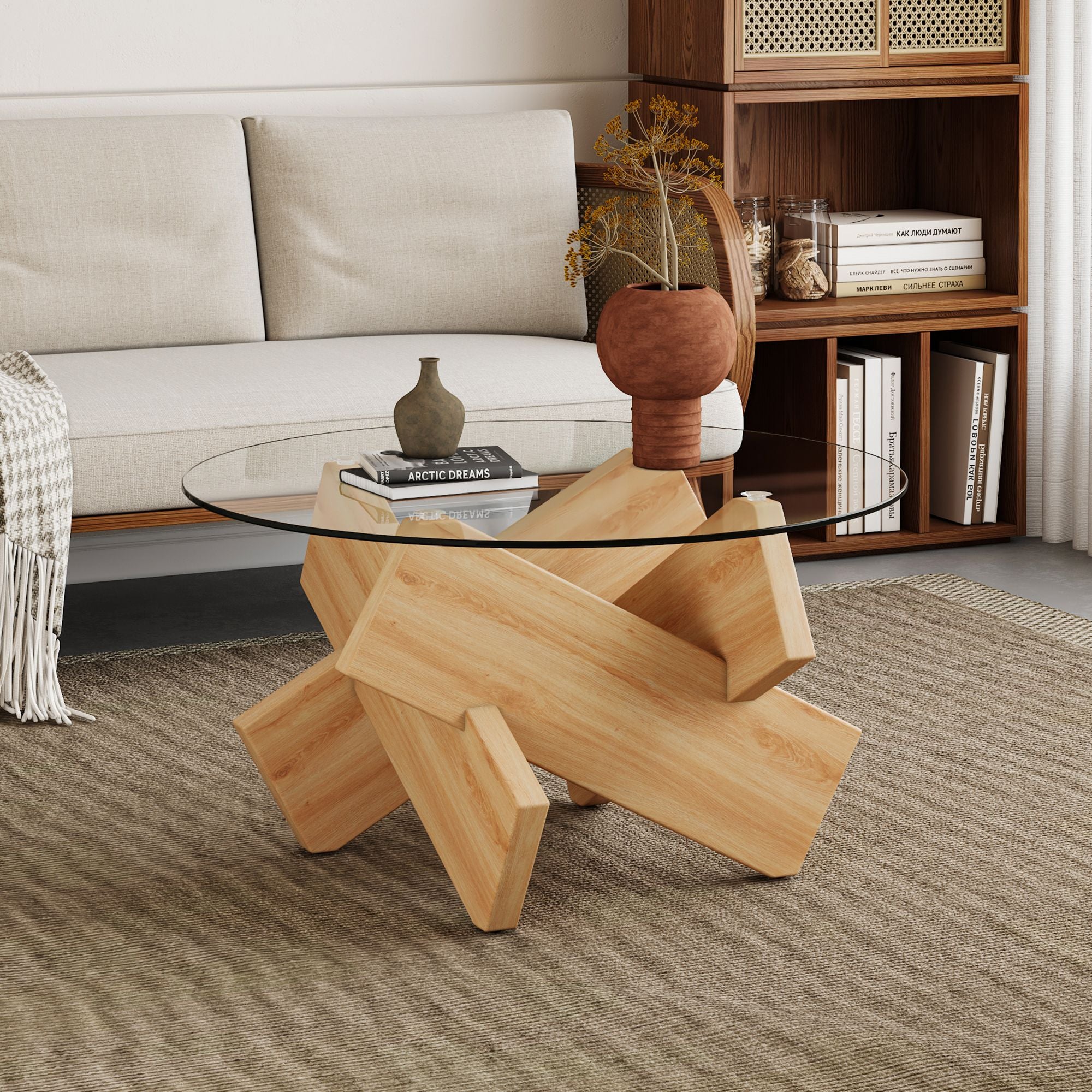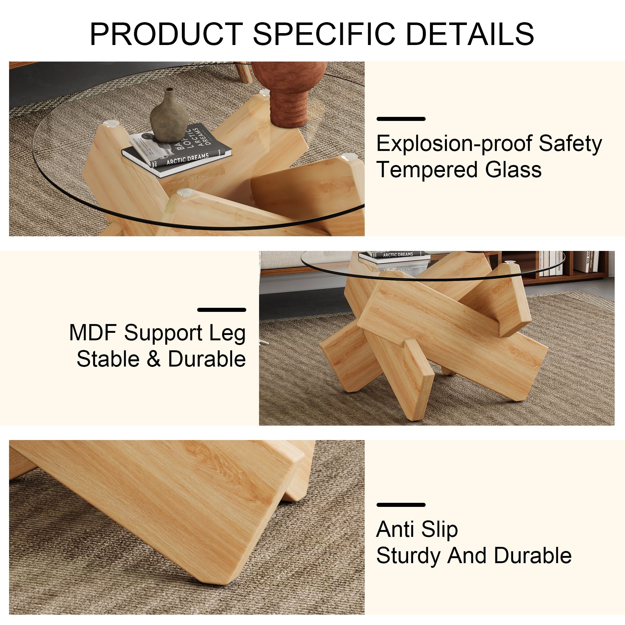 Circular glass coffee table, 33.4-inch modern and distinctive design tea table. Tempered glass countertop, wood colored MDF table legs. Suitable for living rooms and farmhouses