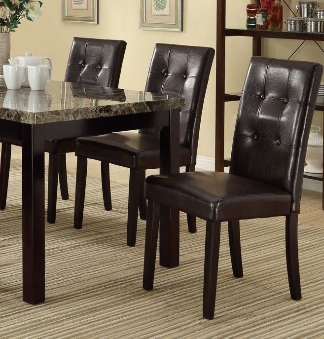 The lap of luxury is delivered with this marble-look or two-toned finished tabletop dining room table. It includes seating for six and a bold frame in dark brown.