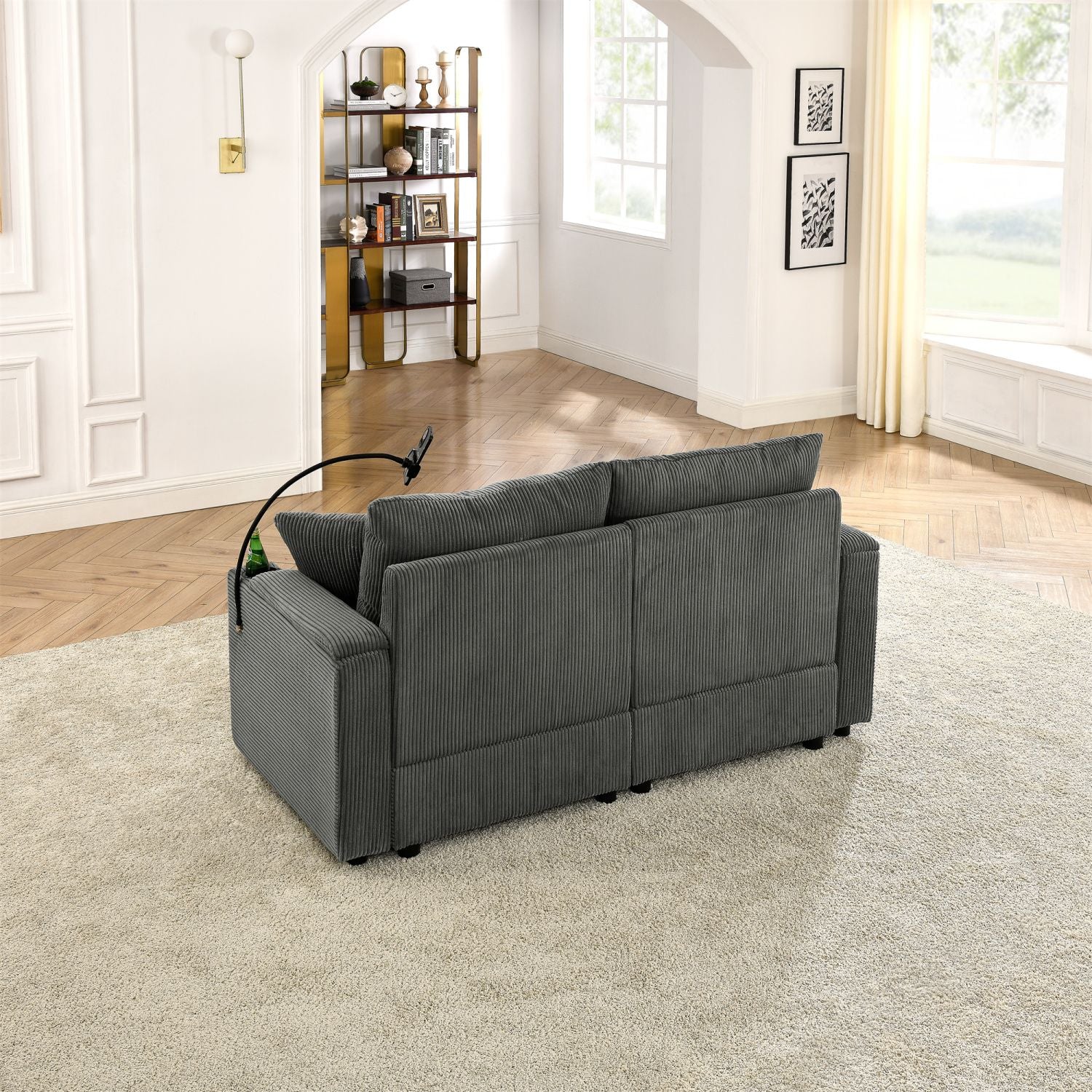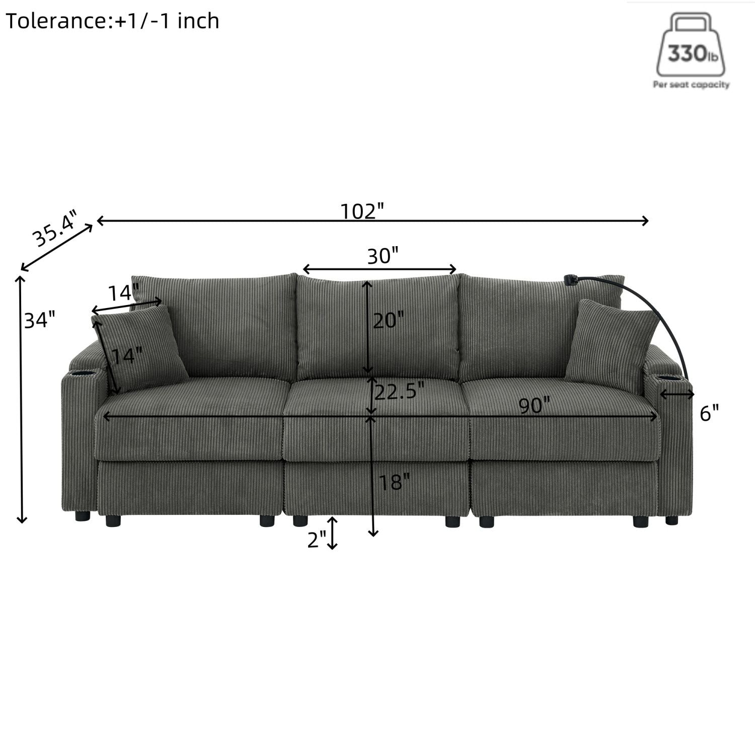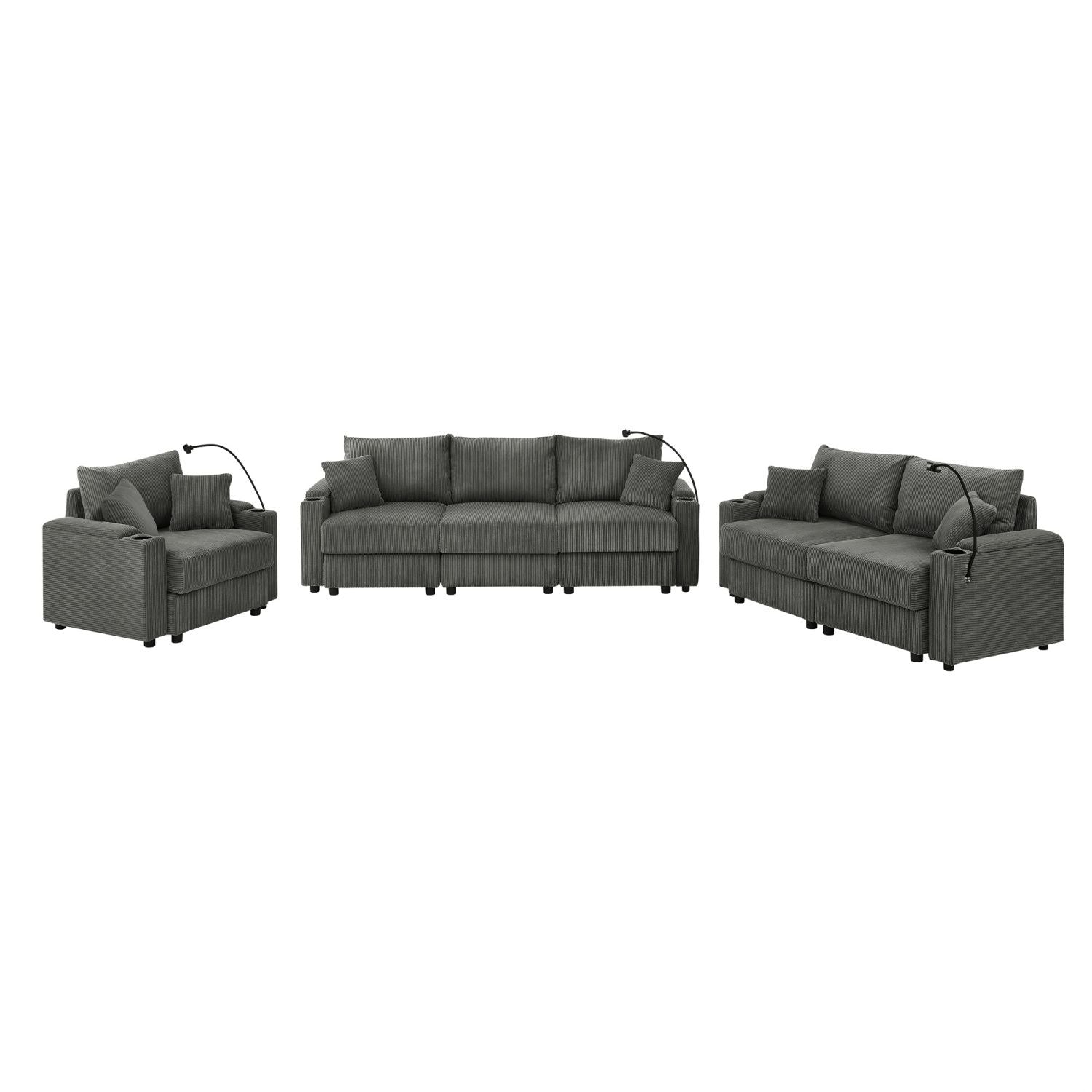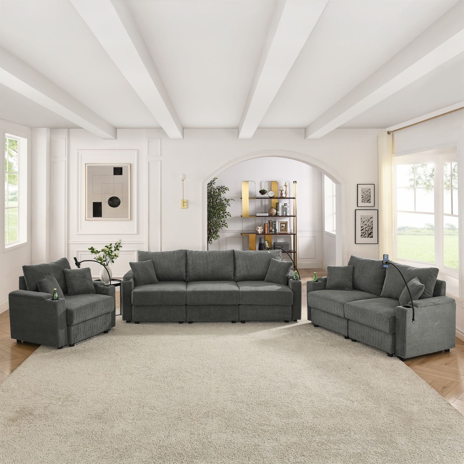 Modern 6 seats Sofa set with Storage, Deep Seat Sofa with Cup Holders & Phone Holder Charging Ports, Corduroy Couch for Living Room,Grey