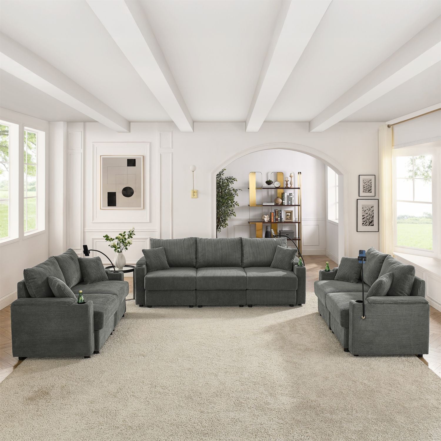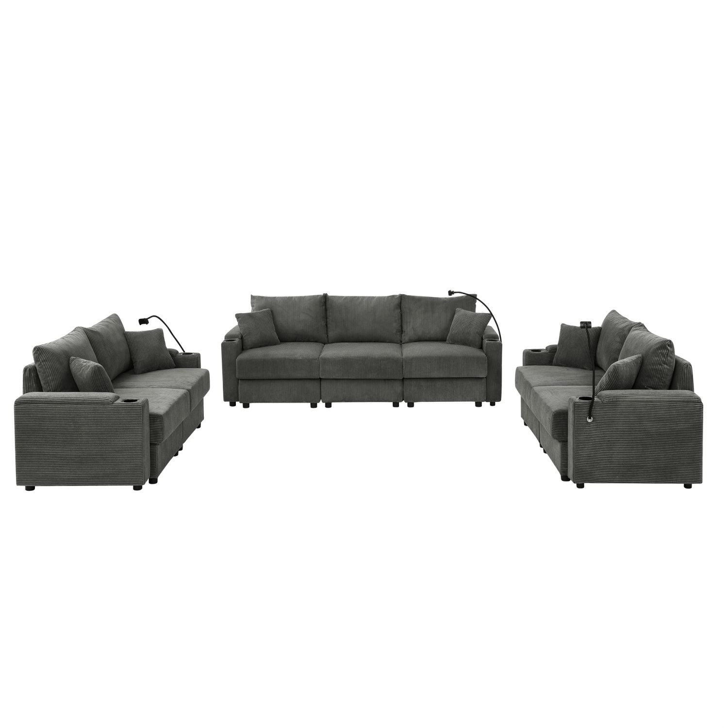 Modern 7 seats Sofa set with Storage, Deep Seat Sofa with Cup Holders & Phone Holder Charging Ports, Corduroy Couch for Living Room,Grey
