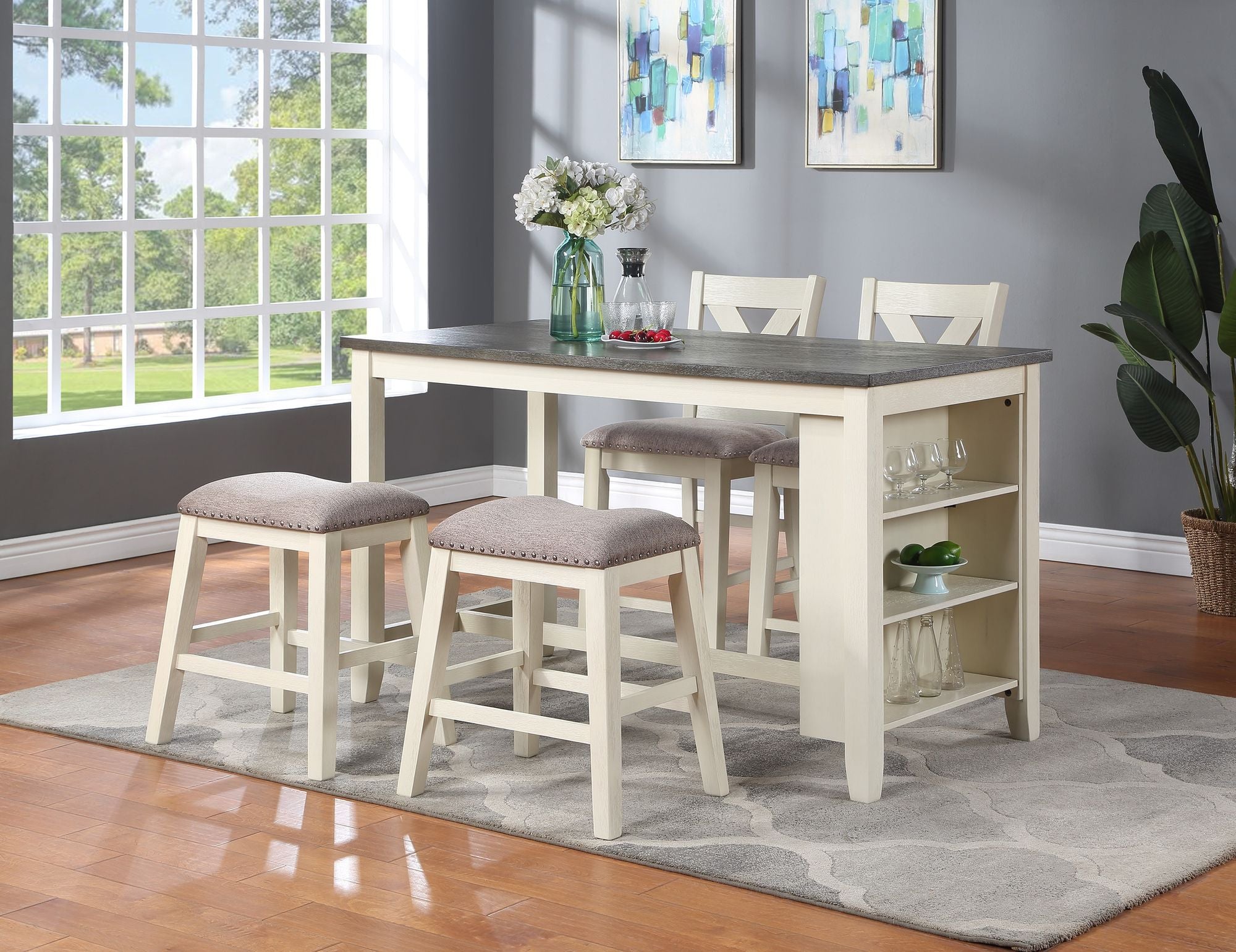 Modern Contemporary 5pc Counter Height High Dining Table w Storage Shelves High Chairs And Stools Wooden Kitchen Breakfast Table Dining Room Furniture